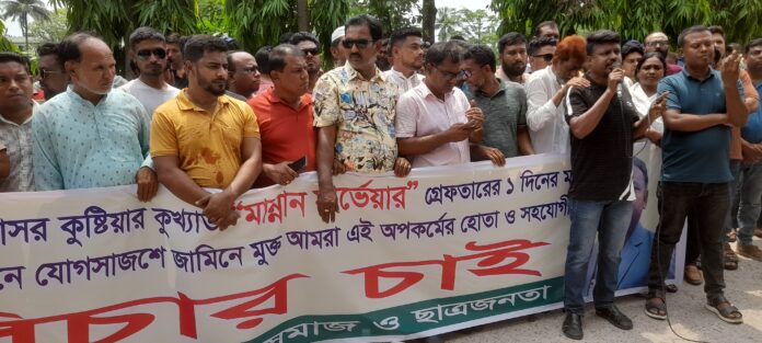 বৈষম্যবিরোধী ছাত্র আন্দোলনের হত্যা চেষ্টা মামলায় কুষ্টিয়া পৌরসভার সার্ভেয়ার আব্দুল মান্নানকে (৪৫) গ্রেপ্তারের পরের দিন জামিনে মুক্তি দেয়ার প্রতিবাদে সুশীল সমাজ ও ছাত্রজনতা আদালত ভবনের সামনে প্রতিবাদ সমাবেশ ও মানববন্ধন করেছে।
