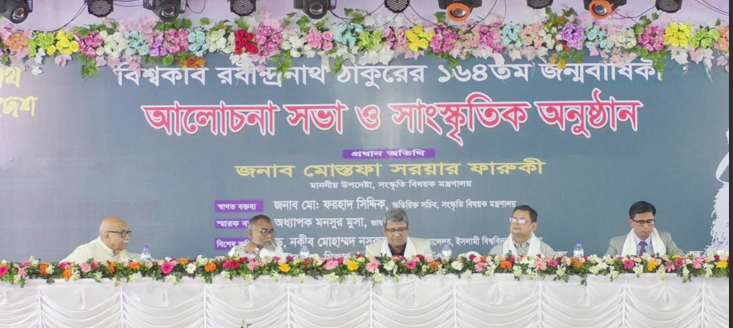 বৃহস্পতিবার (৮ মে) কুষ্টিয়ার শিলাইদহের কুঠিবাড়িতে বিশ্বকবি রবীন্দ্রনাথ ঠাকুরের ১৬৪তম জন্মবার্ষিকী উপলক্ষে আলোচনা সভায় তিনি এসব কথা বলেন।