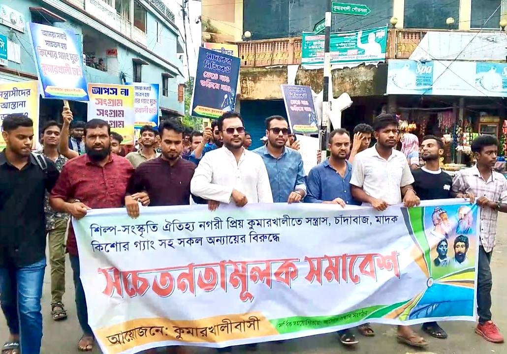 কুষ্টিয়ার কুমারখালীতে সন্ত্রাস, চাঁদাবাজ, মাদক ও কিশোর গ্যাংসহ সকল প্রকার অন্যায় অবিচারের বিরুদ্ধে এক সচেতনতা মূলক সমাবেশ অনুষ্ঠিত হয়েছে।