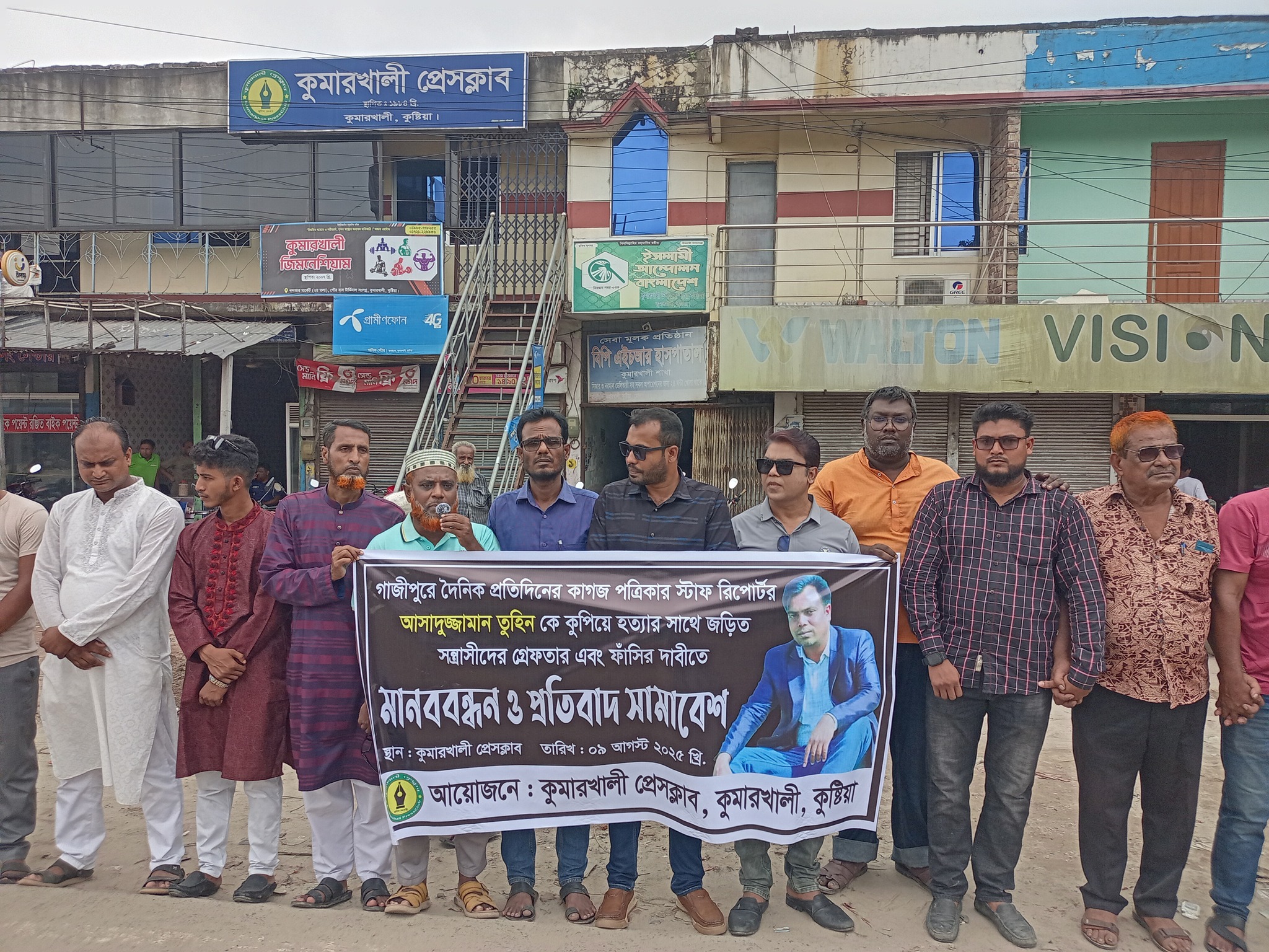 কুষ্টিয়ার কুমারখালীতে গাজীপুরে দৈনিক প্রতিদিনের কাগজ পত্রিকার স্টাফ রিপোর্টার আসাদুজ্জামান তুহিনকে কুপিয়ে হত্যার সাথে জড়িত সন্ত্রাসীদের গ্রেফতার এবং ফাঁসির দাবিতে মানববন্ধন ও প্রতিবাদ সমাবেশ অনুষ্ঠিত হয়েছে।