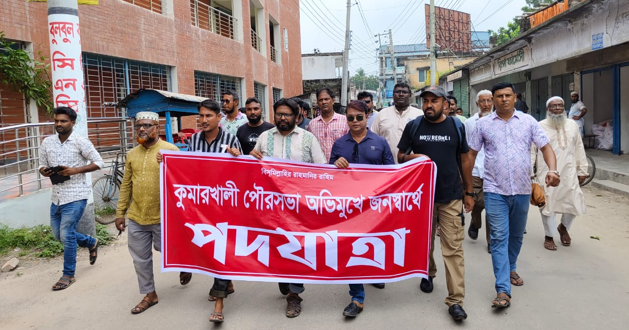 সেজন্য জনদুর্ভোগ কমাতে কুমারখালী শহরের প্রধান সড়কের অবৈধ দখল মুক্তকরণ, যানযাট নিরোসন ও শৃঙ্খলা ফেরানোর দাবিতে পদযাত্রা করেছেন সচেতন নাগরিকরা। মঙ্গলবার (১২ আগষ্ট) দুপুরে শহরের গোলচত্বর এলাকা থেকে পদযাত্রাটি বের করা হয়। পরে স্টেশনবাজার, থানামোড়, গণমোড়, হলবাজার প্রদক্ষিণ করে পৌরসভা চত্বরে এসে শেষ হয়। এরপর সেখানে সংক্ষিপ্ত বক্তব্য শেষে পৌরকর্তৃপক্ষের নিকট স্মারকলিপি প্রদান করা হয়েছে।