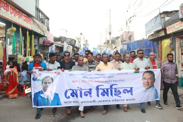 কুষ্টিয়া-৪ (কুমারখালী-খোকসা) আসনে সৈয়দ মেহেদী আহমেদ রুমীর মনোনয়ন পরিবর্তন করে জেলা বিএনপির যুগ্ম আহ্বায়ক, এশিউর গ্রুপের চেয়ারম্যান শেখ সাদীকে প্রার্থী করার দাবিতে মৌন মিছিল করেছে কুমারখালীর বিএনপির একাংশের নেতা-কর্মীরা।