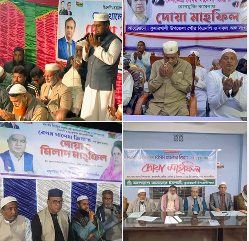 বাংলাদেশ জামায়াতে ইসলামীর দোয়া মাহফিলে প্রধান অতিথি ছিলেন কুষ্টিয়া-৪ আসনের জামায়াত মনোনীত সংসদ সদস্য প্রার্থী মোঃ আফজাল হোসেন। সোমবার সন্ধ্যায় আল ফালাহ মিলনায়তনে এ দোয়া মাহফিল অনুষ্ঠিত হয়। উপজেলা জামায়াতের সেক্রেটারী মামুন অর রশিদের সঞ্চালনায় অনুষ্ঠানে বক্তব্য রাখেন উপজেলা জামায়াতের সহকারী সেক্রেটারী আবুল আহসান শমশের, বায়তুলমাল সম্পাদক মাওলানা আব্দুল হাকিম, কর্মপরিষদ সদস্য আব্দুল মালেক, পৌর জামায়াতের সেক্রেটারী কামাল হোসেন এবং পৌর যুব জামায়াতের সভাপতি মাসুদ রানা প্রমুখ। আলোচকবৃন্দ ৪ দলীয় জোটের বিভিন্ন বিষয় উল্লেখপূর্বক বেগম খালেদা জিয়ার ভূমিকা তুলে ধরেন। উক্ত অনুষ্ঠানে দোয়া পরিচালনা করেন উপজেলা জামায়াতের বায়তুলমাল সম্পাদক মাওলানা আব্দুল হাকিম। শেষে দেশ ও জাতির কল্যাণ এবং বেগম খালেদা জিয়ার সুস্থতা কামনায় বিশেষ মোনাজাত করা হয়।