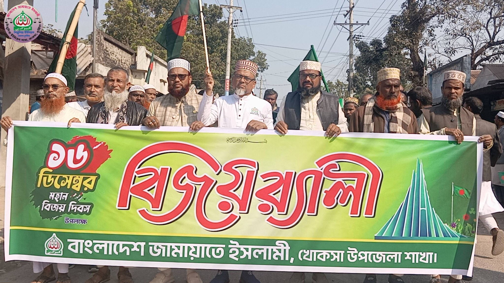 মহান বিজয় দিবস উপলক্ষে কুষ্টিয়ার খোকসা উপজেলায় এক বিশাল ও সুশৃঙ্খল র্যালি আয়োজন করেছে বাংলাদেশ জামায়াতে ইসলামী খোকসা উপজেলা। খোকসা উপজেলা গেট থেকে শুরু হওয়া এই র্যালিটি খোকসা বাজারের প্রধান প্রধান সড়ক প্রদক্ষিণ করে এক উৎসবমুখর পরিবেশ সৃষ্টি করে। শৃঙ্খলার অনন্য দৃষ্টান্ত র্যালিটি ছিল চোখে পড়ার মতো।